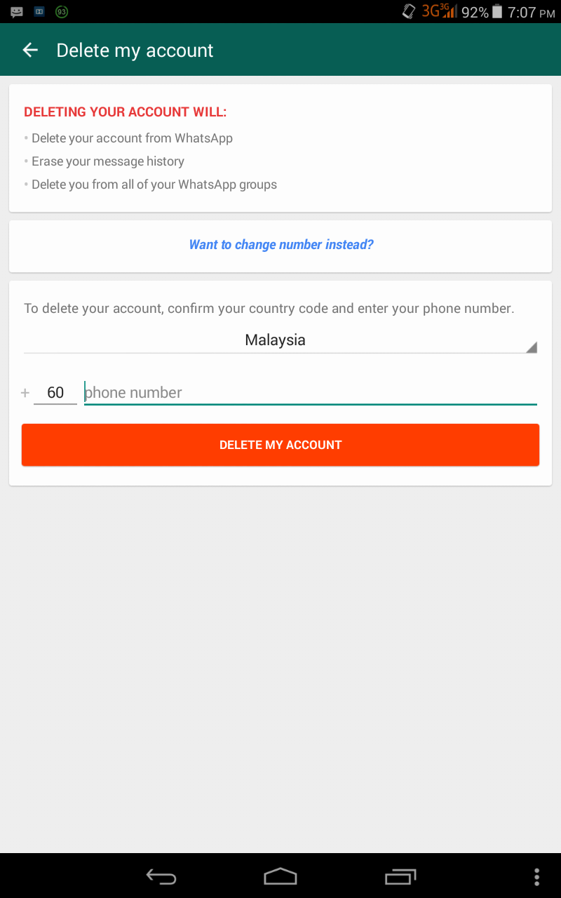Korang cuma perlu masukkan number korang yang korang daftar untuk akaun Whatsapp tu. Seperti dalam gambar di atas, kalau korang delete akaun Whatsapp korang, salah satu kesannya adalah korang akan keluar dari kesemua group dalam Whatsapp yang korang dah masuk. Tapi dalam group tu, korang tak akan dikatakan 'leave group' tau. Sebaliknya dikatakan 'removed'. Nampak seperti korang kena removed oleh admin group.